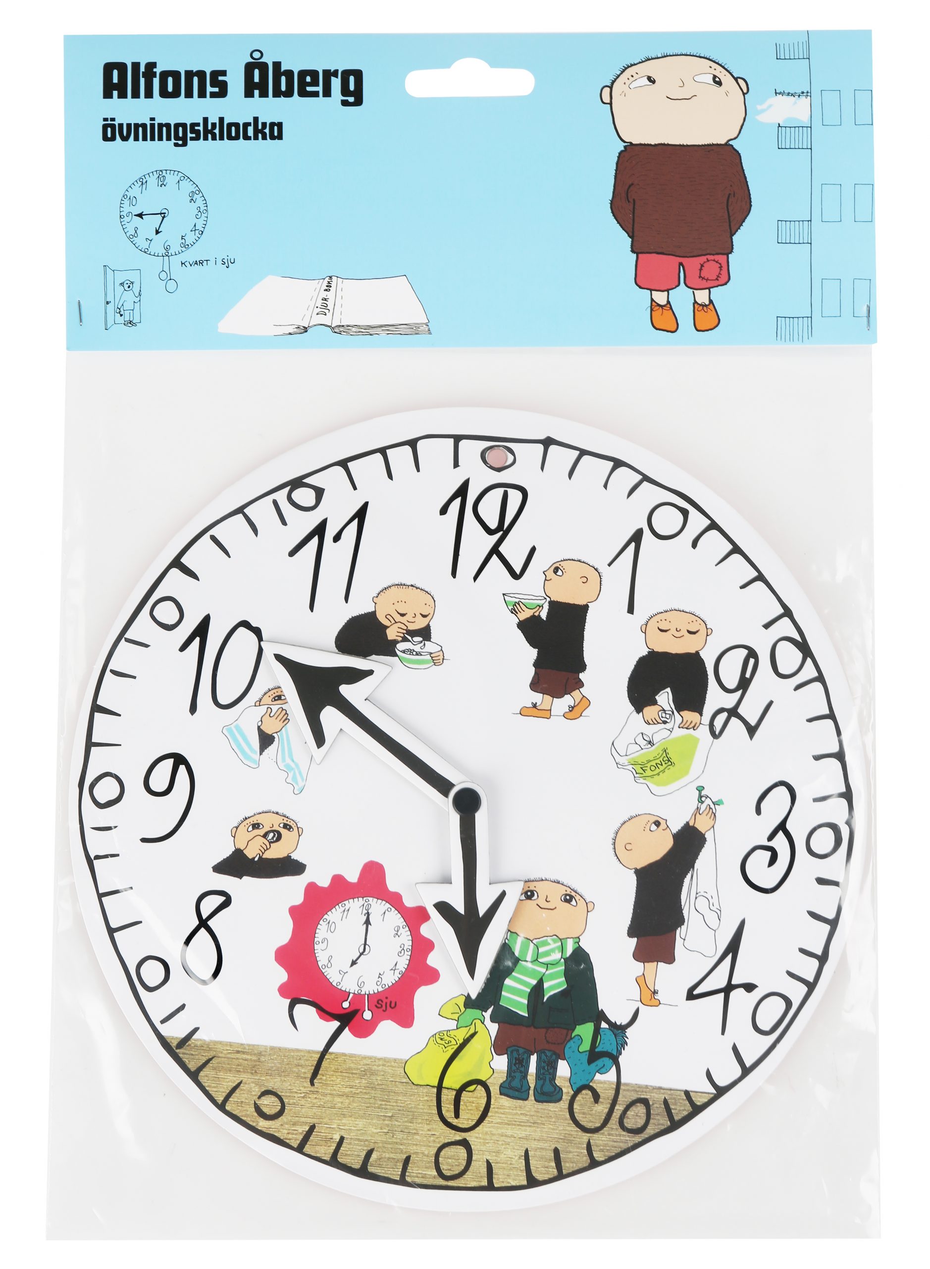 Lär dig klockan tillsammans med Alfons Åberg. Vrid på övningsklockans visare och träna på klockan; halv nio borstar Alfons tänderna, klockan två plockar han undan leksakerna men vad händer klockan sju då? Klockan är tillverkad av returkartong och upptill har den ett litet hål för upphängning på krok eller spik.