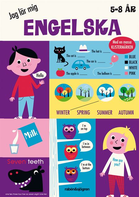 Hitta det engelska ordet för ost, klistra rätt kläder på barnen och skriv veckodagarna i kalendern. Några pyssel är lättare och andra lite klurigare. i mitten finns ett ark med fina klistermärken.