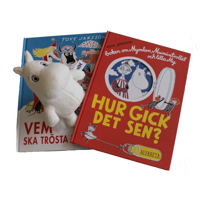 I vårt fina Muminpaket ingår bilderböckerna Hur gick det sen?, Vem ska trösta Knyttet? samt en mjuk Mumindocka (15 cm).