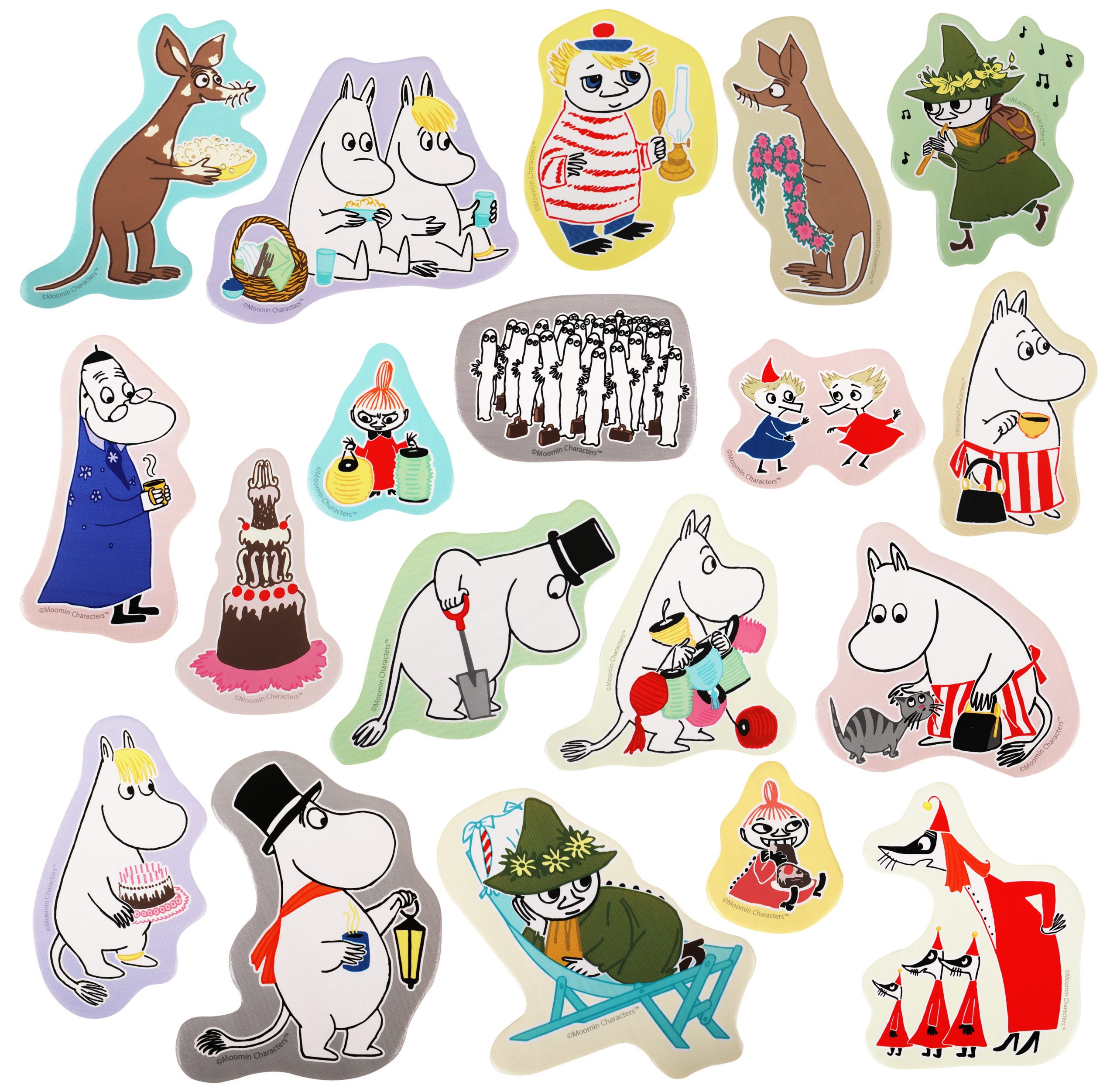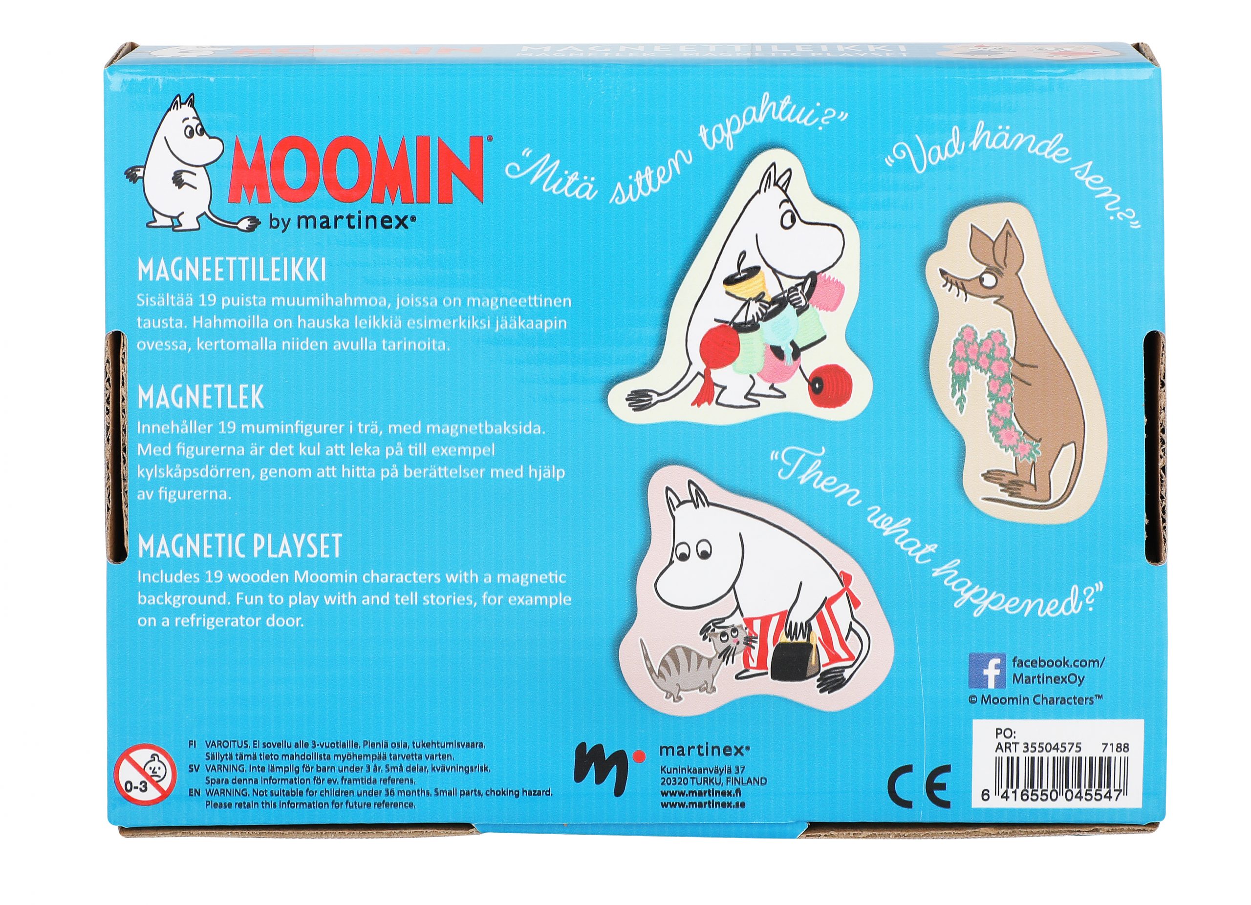 19 figursågade, färgglada muminfigurer i trä, med magnetbaksida. Är det dags att bjuda muminvännerna på fest? Varför gräver Muminpappa i jorden och vart är Snusmumriken på väg? Fantasifull och kul kylskåpslek! 3+