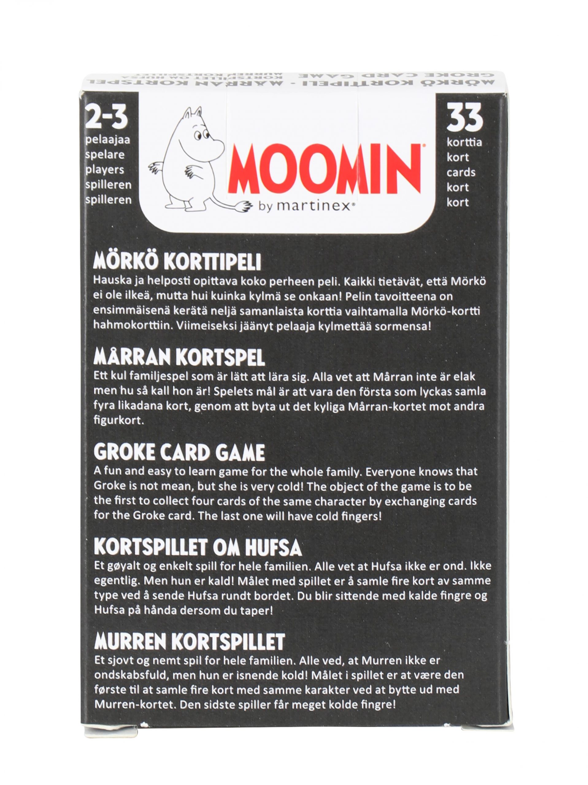 Ett kul familjespel som är lätt att lära sig. Alla vet att Mårran inte är elak men hu så kall hon är! Spelets mål är att vara den första som lyckas samla fyra likadana kort, genom att byta det kyliga Mårran-kortet mot andra figurkort. Kortleken består av 33 figurkort. Regler på svenska, finska, norska, danska, engelska. Tillverkningsland Sverige. För 2-3 spelare. Ålder 4+, Speltid ca. 5 min