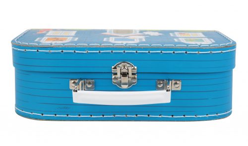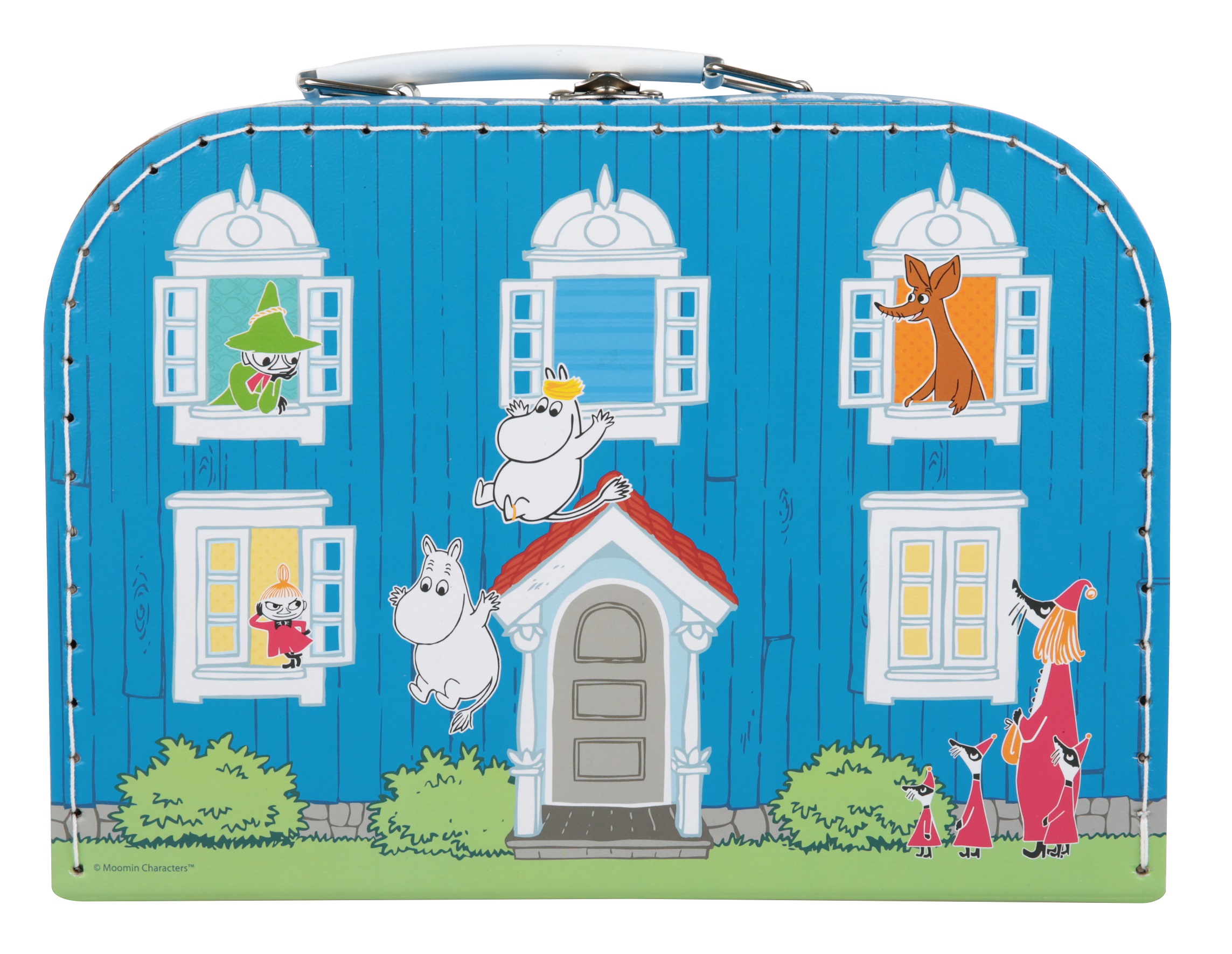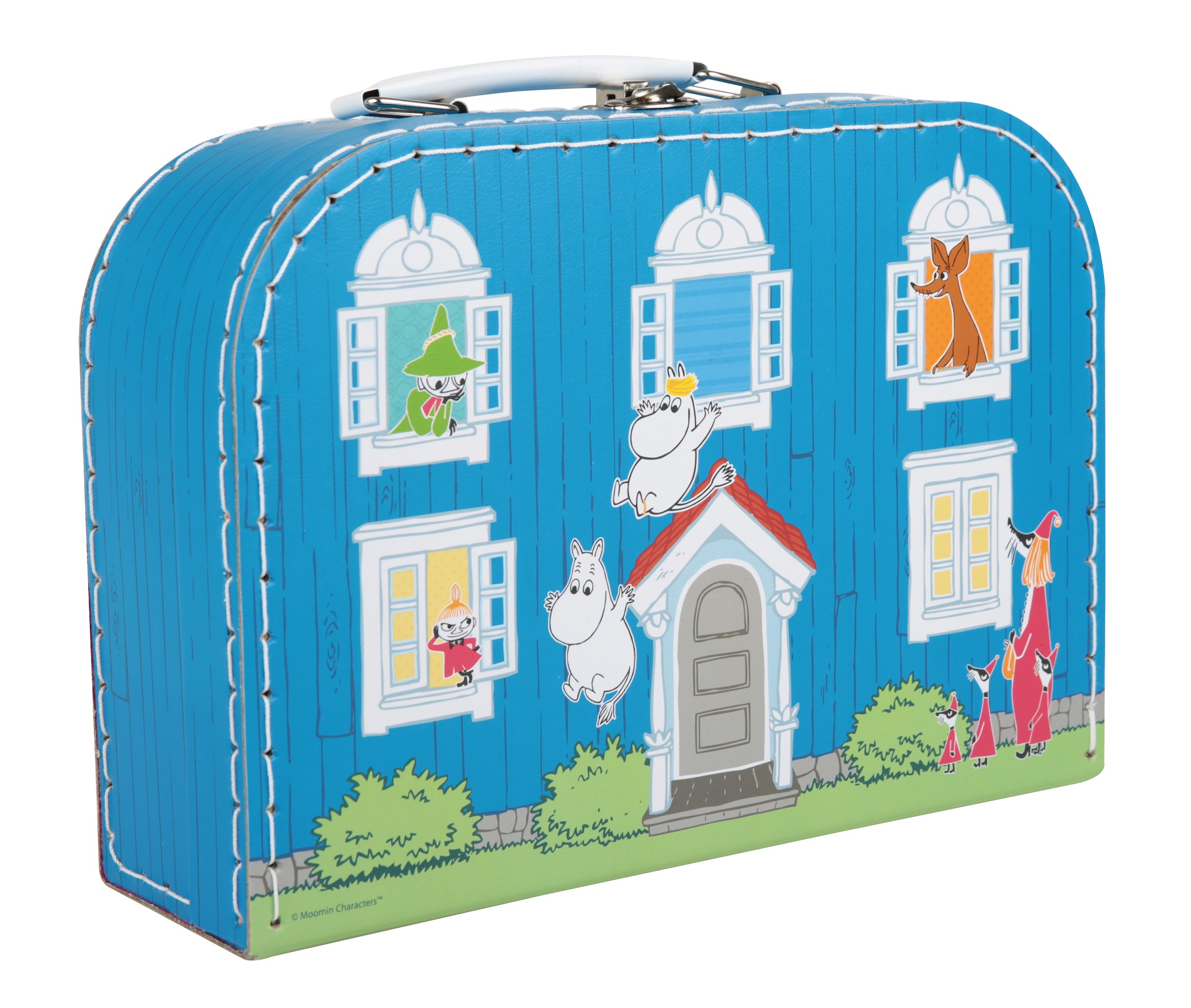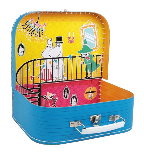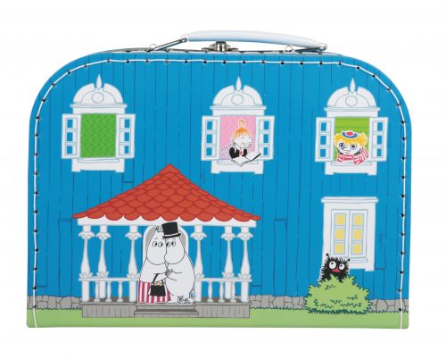 Blå pappväska med fartfyllt Muminmotiv av Muminhuset och Muminvännerna. När man öppnar väskan kikar man in i huset! Väskan har handtag och lås i metall. 0+