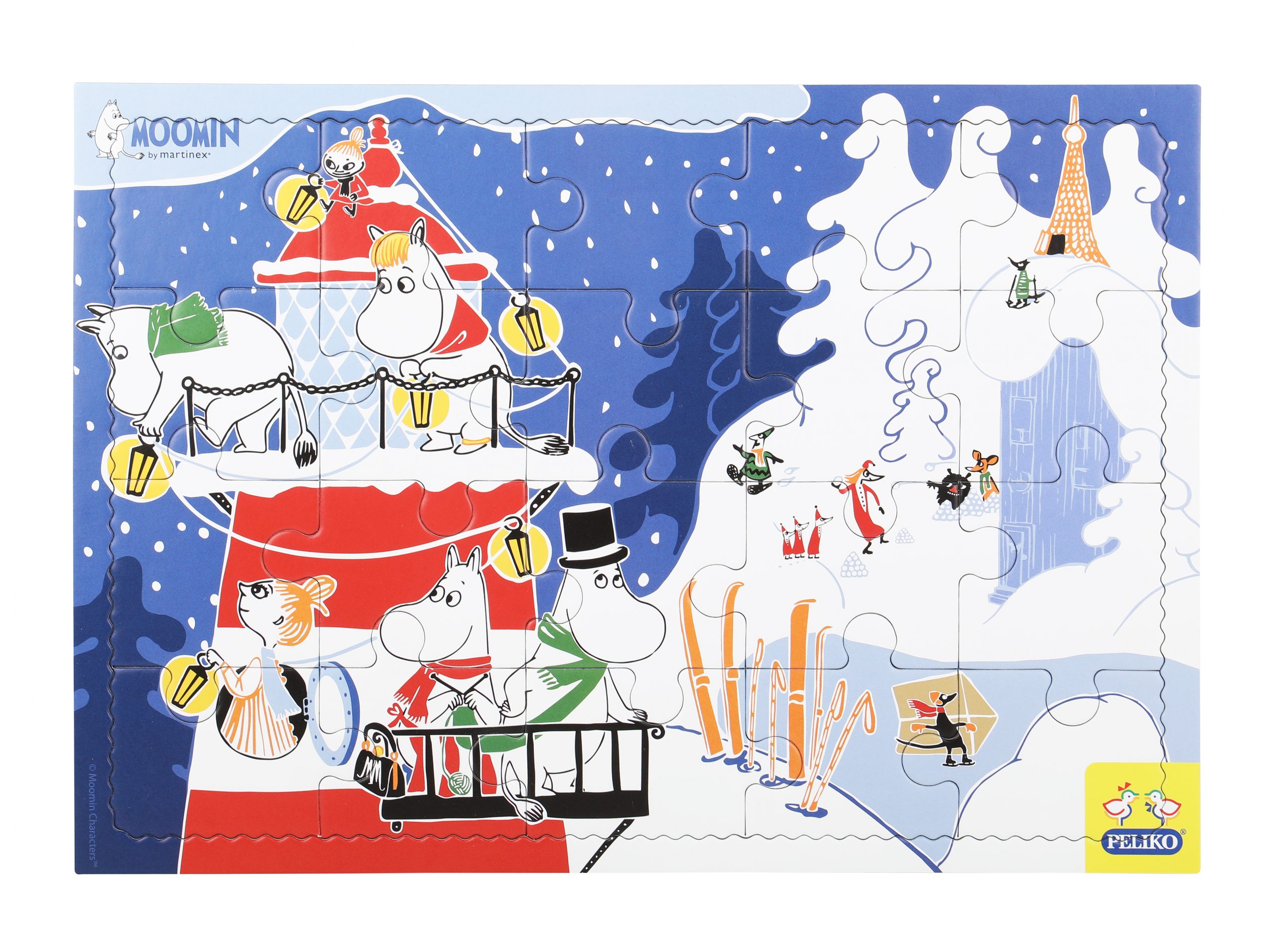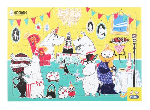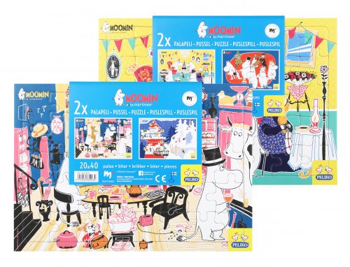 Två stycken rampussel med fina och färgglada muminmotiv. Storleken på pusslen är A4 och mängden bitar är 20 för det ena pusslet och 40 bitar för det andra. Pusslen är tillverkade av returkartong.