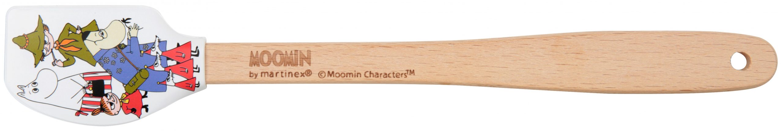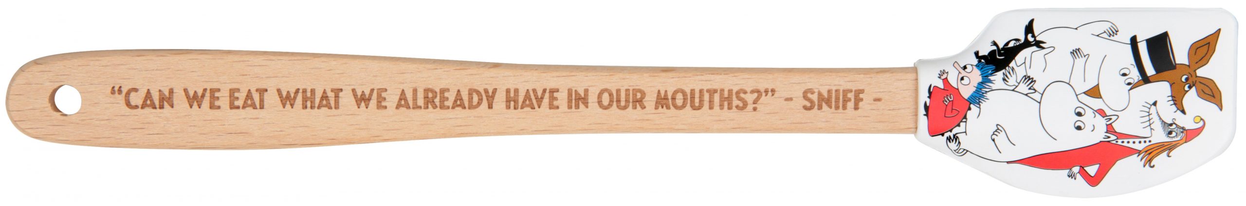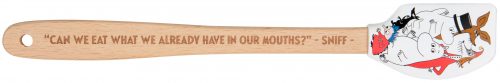 En minislickepott med silikonblad i vitt och ett fint motiv av mumingänget i färg på bägge sidor. Skaftet är av trä och högst upp på skaftet finns det ett hål för upphängning på tunn krok. På den ena sidan av skaftet står det i lasergravyr ’Can we eat what we already have in our mouths?’ – Sniff. Handdisk rekommenderas. Levereras i pappställ.