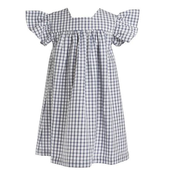 Klänning i förklädesmodell. Blå rutor på vit botten. 100 % bomull. Klänningen finns i en storlek, ca 3-7 år. Tvättas i 60 grader och hängtorkas.