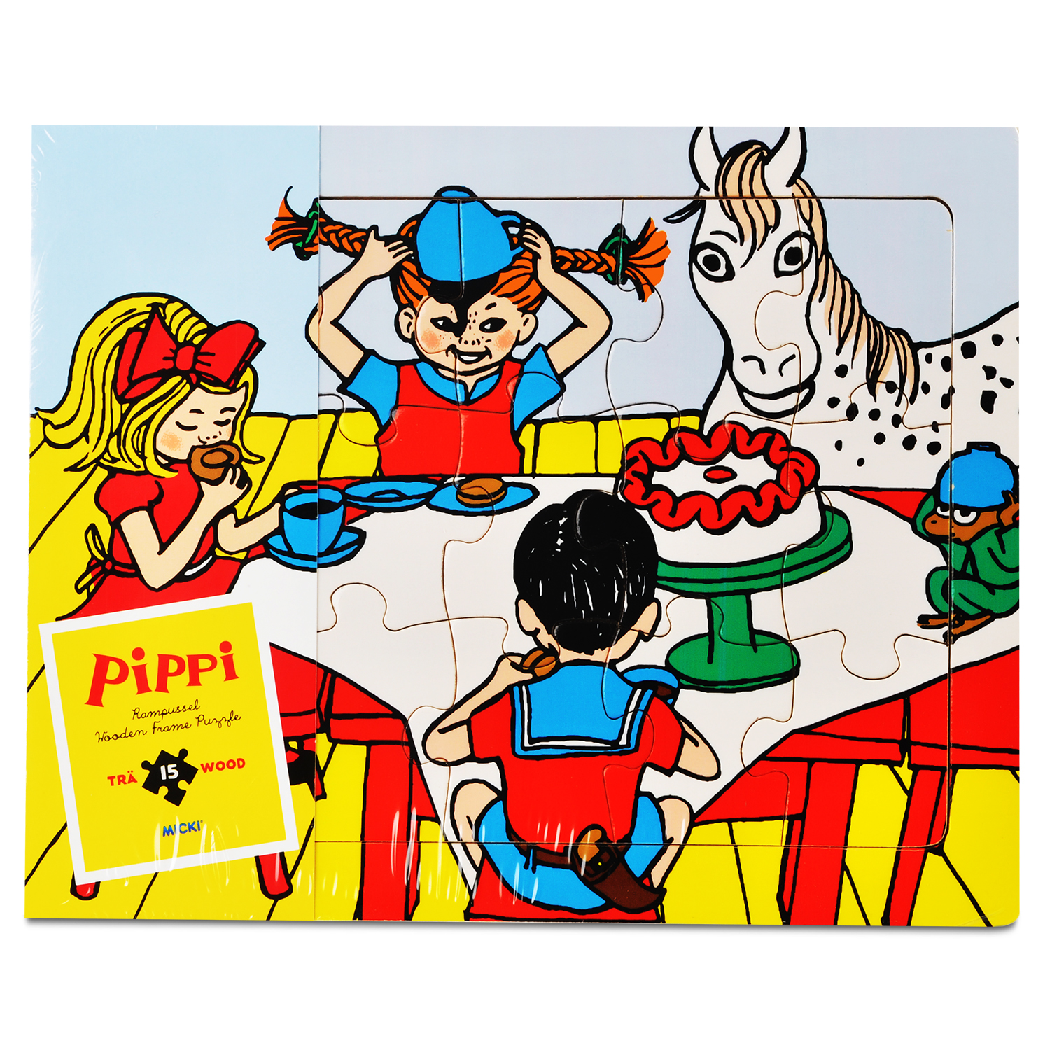 Pussla med Pippi och vännerna! Här har de kaffekalas och Pippi fikar på sitt eget sätt… Pusslet läggs i sin ram vilket ger lite hjälp på traven. Pusslet är gjort av trä och innehåller 15 pusselbitar. Illustration av Ingrid Vang Nyman. Mått 22×18 cm.