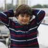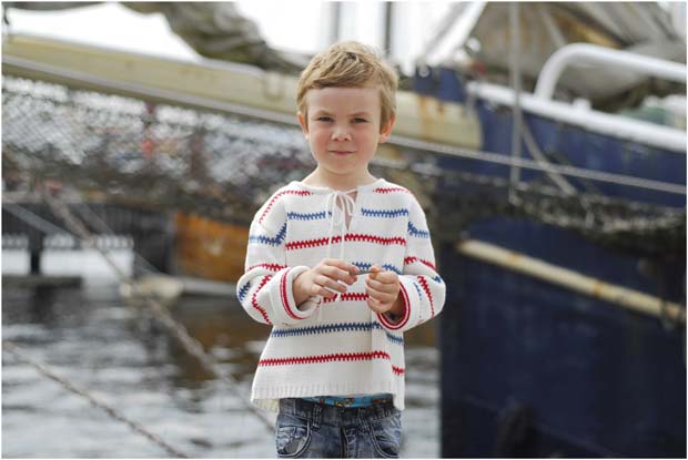 Stickad barntröja i 100 % bomull. Vit med blå och röda ränder. Finns i storlekarna 98/104, 110/116, 122/128, 134/140, 146/152 och 158/164. Tvättas i 40 grader och plantorkas.